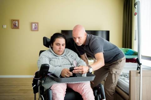‘Toen de omgevingsbesturing eenmaal bepaald was, was het tijd om met de individuele besturing aan de slag te gaan. Roel kwam met het idee om een demoruimte in te richten, waar bewoners zelf konden uitproberen welk type afstandsbediening het beste bij hun past.’ ‘Op basis van de gekozen omgevingsbesturing hebben Werner en ik een lijst opgesteld met de verschillende besturingsmogelijkheden. In een speciaal ingerichte demoruimte konden zij deze tools vervolgens uitproberen. Toen bepaald was wie met welk hulpmiddel zou gaan werken, zijn we in samenwerking met persoonlijk begeleiders, fysiotherapeuten, ergotherapeuten en gedragskundigen de bewoners in kleine groepjes gaan trainen. Leuk om te vermelden is dat we voor een inwoner met beperkte motoriek een specifiek hulpmiddel in gedachten hadden. Toen hij in de demoruimte zag hoe ik met een cliënt het gebruik van een andere afstandsbediening oefende, wilde hij die ook uitproberen. Wat bleek: die werkte voor hem fantastisch. Onverwachts, en een mooi voorbeeld van de meerwaarde van een demoruimte.’
