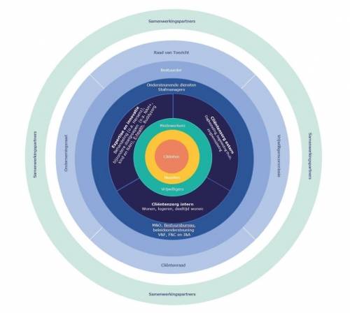 In het organogram gaan we uit van de cliënt die centraal staat, met daaromheen de mensen en disciplines die van belang zijn. Werkten we tot nu toe in een regio-indeling, per 1 januari zetten we dat om in een diensten-indeling.