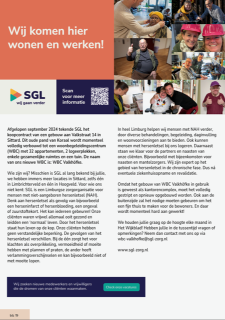 Het Wijkblad is het (bijna) maandelijkse huis-aan-huis blad van de wijken Limbrichterveld en Hoogveld in Sittard. Hierin zullen we 10x per jaar een artikel publiceren over WBC Valkhöfke, dat momenteel gebouwd/verbouwd wordt in de Valkstraat in de wijk Limbrichterveld. Denk aan bouwupdates, interviews met bewoners en medewerkers, oproepjes voor nieuwe medewerkers of vrijwilligers, nieuws over SGL algemeen en ga zo maar door.
